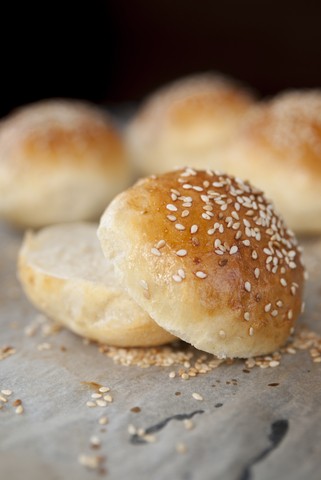 Varm opp melken til den er fingervarm. Hell den i en bolle og løs opp gjæren i den. Tilsett først salt, egg og olje og deretter melet litt om gangen. Elt det hele sammen til en smidig deig. La deigen heve tildekket på et lunt sted i ½ time. Vend den ut på en meldrysset benk og skjær den i 8 deler. Form hver del til en stor, flat bolle, ca. 1 cm tykk. La bollene etterheve i ½ time. Pensle dem forsiktig med egg og dryss med sesamfrø. Stek brødene i en 200° varm ovn i ca. 14 minutter.